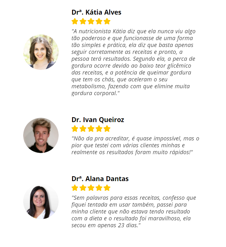 ''No início eu hesitei. Emagrecer com Receitas? Eu pensei, impossível né?! Mas eu resolvi dar um voto de confiança e realmente funcionou. Na verdade até mais do que eu esperava porque o meu objetivo era emagrecer 5 quilos e eu emagreci 7,5 quilos. E o bom é que você emagrece comendo um alimento saudável e o chá então? É o melhor da história. Voltei a usar a calça jeans e alguns vestidos curtos que eu não podia mais.''